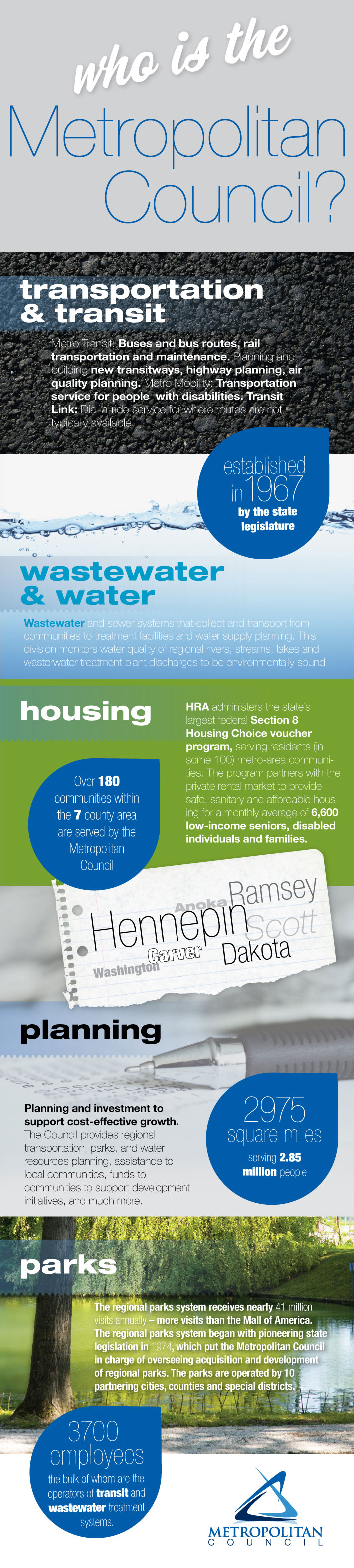 The Metropolitan Council is the regional policy-making body, planning agency, and provider of essential services in the seven-county Twin Cities metro area. Our mission is to foster efficient and economic growth for a prosperous region.