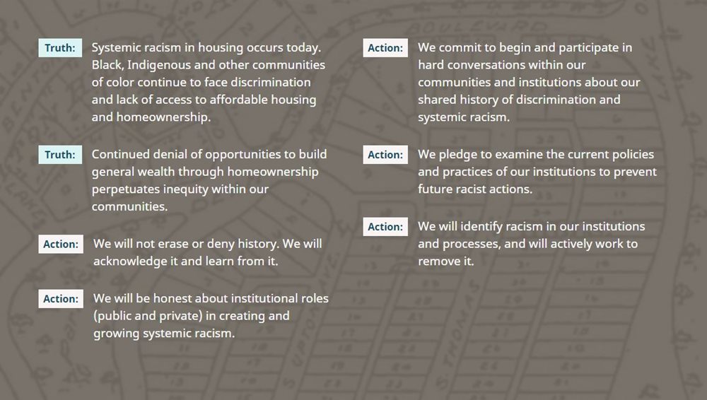 Acknowledging the existence of systemic racism and government’s role in creating and upholding these systems of oppression is a key first step to joining the Just Deeds Coalition. As a result of this acknowledgement, participants must also be willing to accept that it is their responsibility to create change and repair harm.