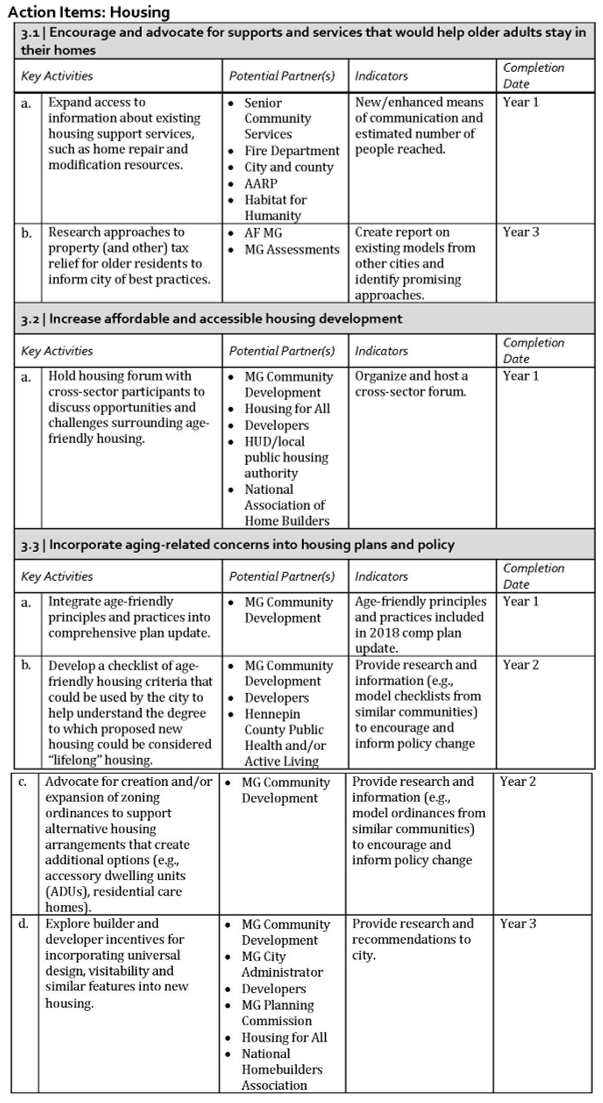 In July 2018, the City adopted the 2018-2021 Age-Friendly Maple Grove Action Plan. The AF-MG Action Plan addresses policy, program/services, and built environment and includes short-term and long-term goals and actions that involve the City, nonprofits, businesses, community members, and other partners. The Action Plan includes a summary of goals for each domain with: 1) key activities needed to achieve the goals, 2) who must be involved and potential partners, 3) indicators that measure progress, and 4) the anticipated completion date for the goals. Linked here is an example of the format for a goal that included integrating age-friendly discussion into the City’s 2040 comprehensive Plan.