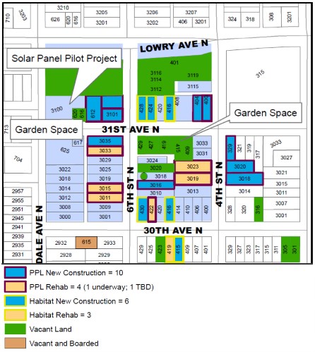 primarily residential, with office-residential on Lowry Svenue west of 6th Street. The land use guidance for the area could allow changes in zoning for some neighborhood-serving commercial at Lowry and Lyndale. For next steps, the neighborhood hopes to add multifamily apartments, townhomes, and continue to work with the vacant lots—so long they still have the resources and support required. Their vision is to eventually become a vibrant neighborhood that can provide a diverse range of quality housing and healthy living.