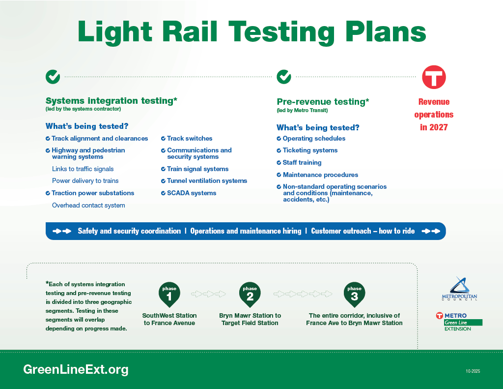 The commencement of light rail train testing activities will include public notifications. Materials describing the testing and time frame are provided at GreenLineExt.org.
