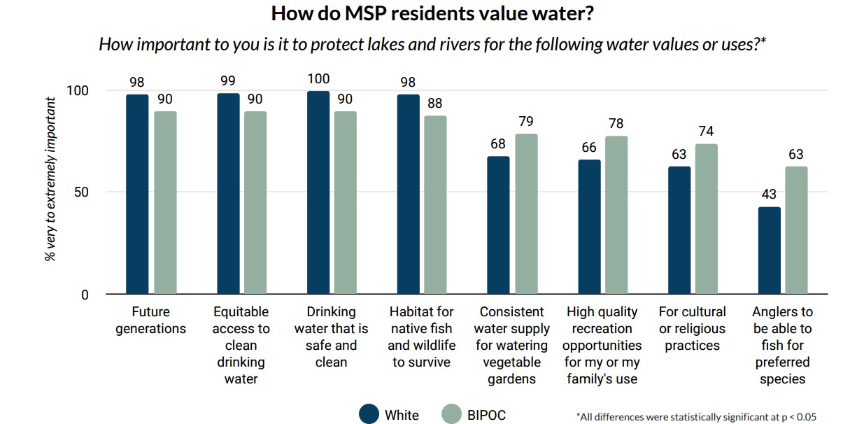 Council staff have worked with experts at the University of Minnesota to identify resident values that can inform equitable water policy, planning, and management, and provide approaches for fair and just decision-making. In 2020 due to pandemic restrictions, a mail survey asking residents about their perspectives and experiences was sent to zip codes throughout the region. Researchers received a strong response rate and valuable understanding was gained. However, the demographics of the respondents didn’t reflect the diverse perspectives of the region’s residents. After the lifting of pandemic restrictions and modifying the survey, researchers were able to attend 14 community cultural events, receiving over 1000 responses from the region’s residents, with respondents self-identifying as 55% female, 67% non-white, and 47% renter. Resident responses show that water is highly valued in the region, with safe and clean drinking water, equitable access to clean drinking water, and water for future generations being of the highest importance. Responses also revealed cultural differences regarding drinking water quality, the use of bottled water, trusted sources of and access to water information, concerns about climate change and flooding, and priority water uses. These differences reflect the need to understand and incorporate diverse perspectives into policies, work approaches, resource allocation, and communications.